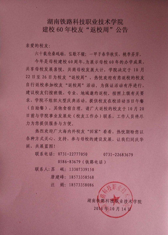湖南铁路科技职业技术学院建校60年校友“返校周”公告