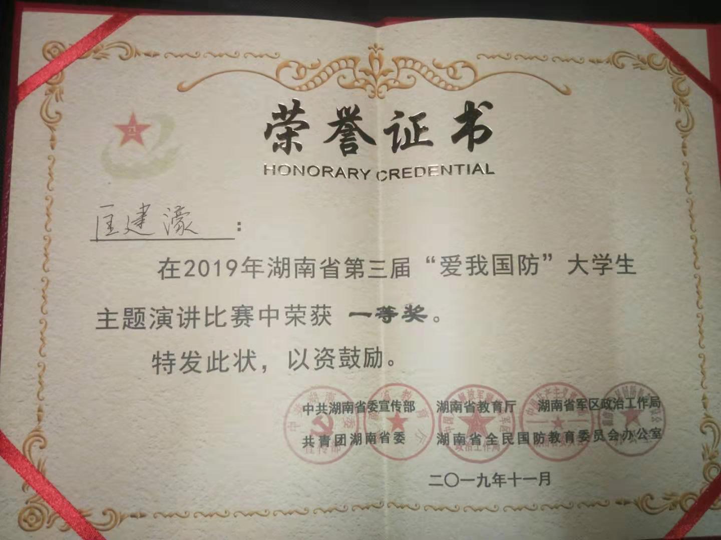 11月30日下午,由中共湖南省委宣传部、湖南省教育厅、湖南省军区、共青团湖南省委、湖南省国教办举办的湖南省第三届“爱我国防”大学生主题演讲比赛总决赛落下帷幕。经初赛、复赛,最终来自湖南大学、中南大学等12所高校的选手进入总决赛。学院铁道运输管理与经济学院学生匡建濠以9.71分的高分勇夺总决赛第一名,获大赛一等奖。