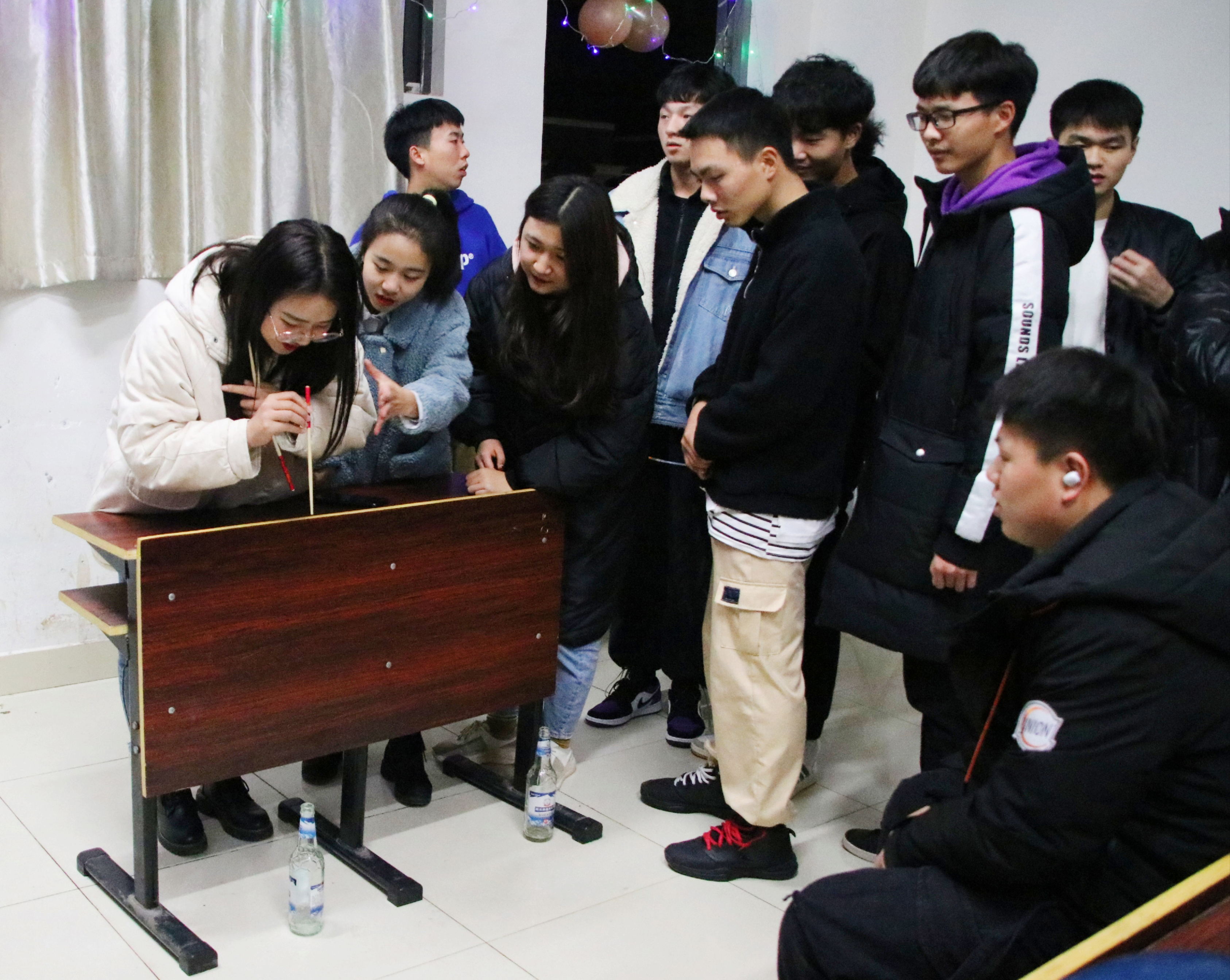 霓虹灯如同闪烁的星辰,忽明忽暗地照亮着夜里的教学楼;或婉转或激昂的歌声在教室里飘扬着,连同呐喊声、欢呼声一同汇聚成了一片欢乐的海洋。“憋笑挑战”“珠行万里”“疯狂保龄球”——游园会设置的趣味游戏项目很快就吸引了大批“身怀绝技”的参与者。“昨天我吃了一碗饭、 两个鸡蛋”“昨天我吃了一碗饭、两个鸡蛋、三块牛肉”……“越吃越多”项目要求挑战者必须记住前者所说的所有食物,为了让对手卡顿失败,选手们不惜牺牲个人形象,纷纷化身为“超级大胃王”,与对手进行激烈比拼。