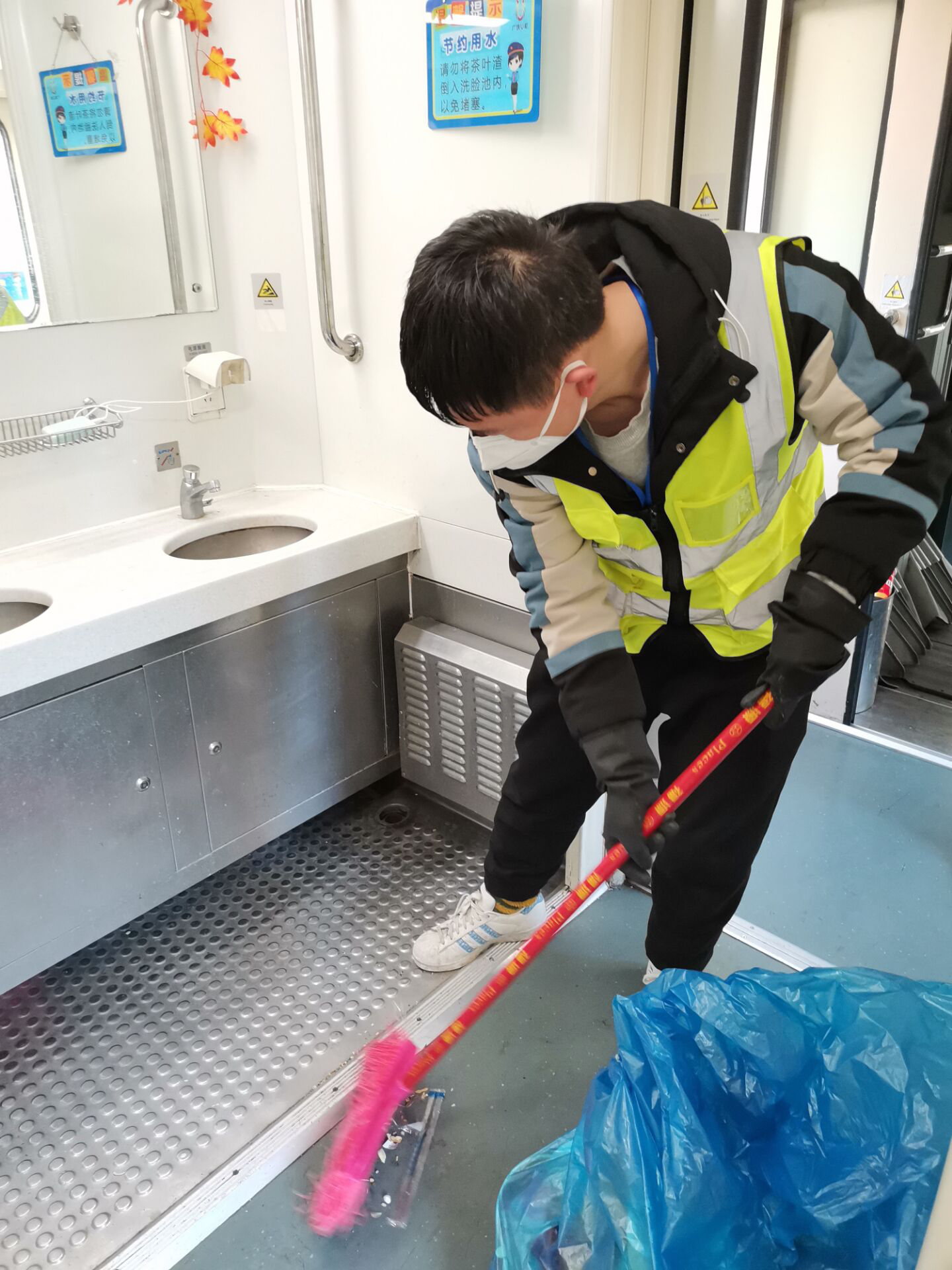 深新二组郭航在打扫洗漱间卫生