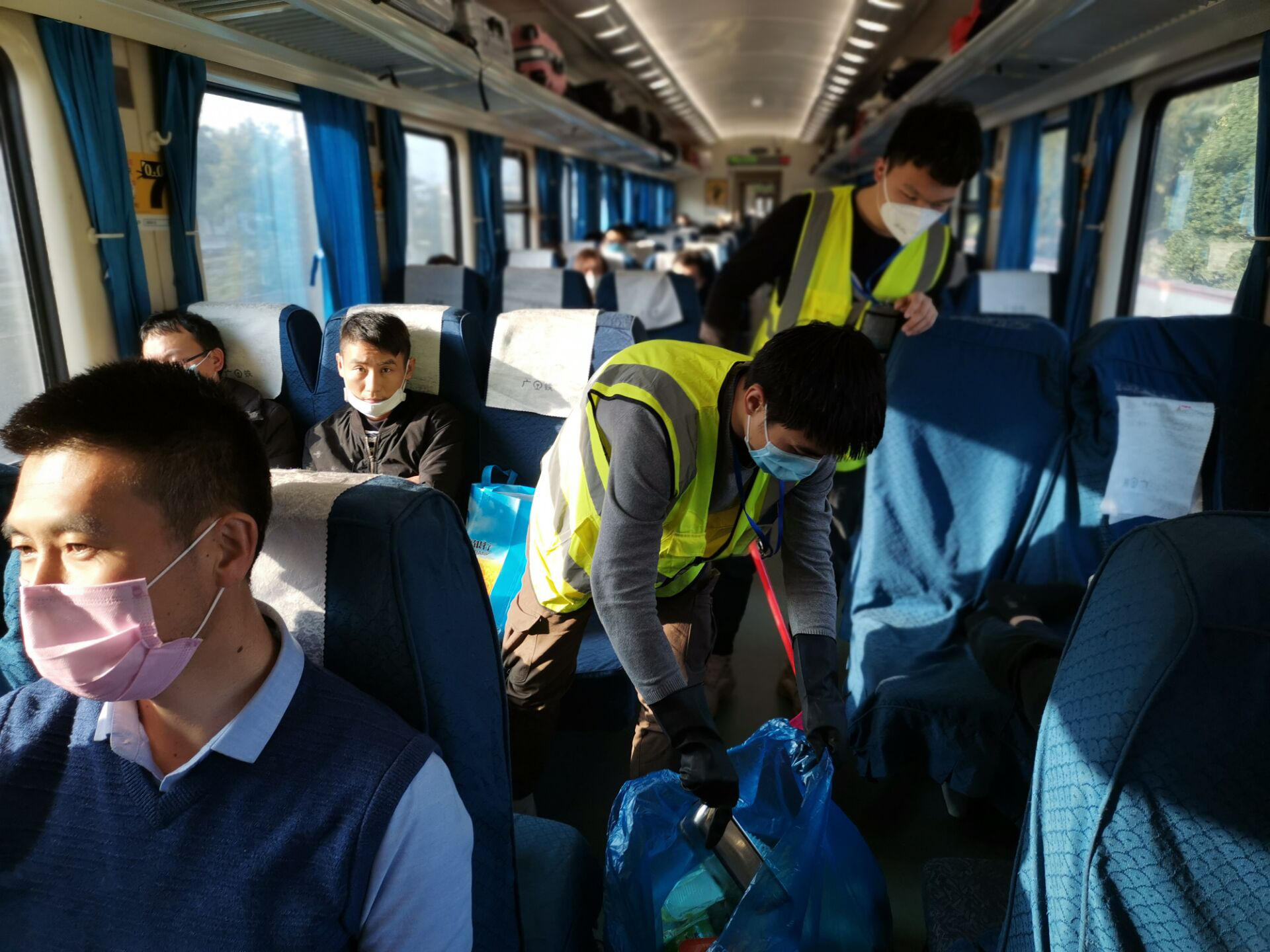 深新二组的同学们在打扫车厢内卫生