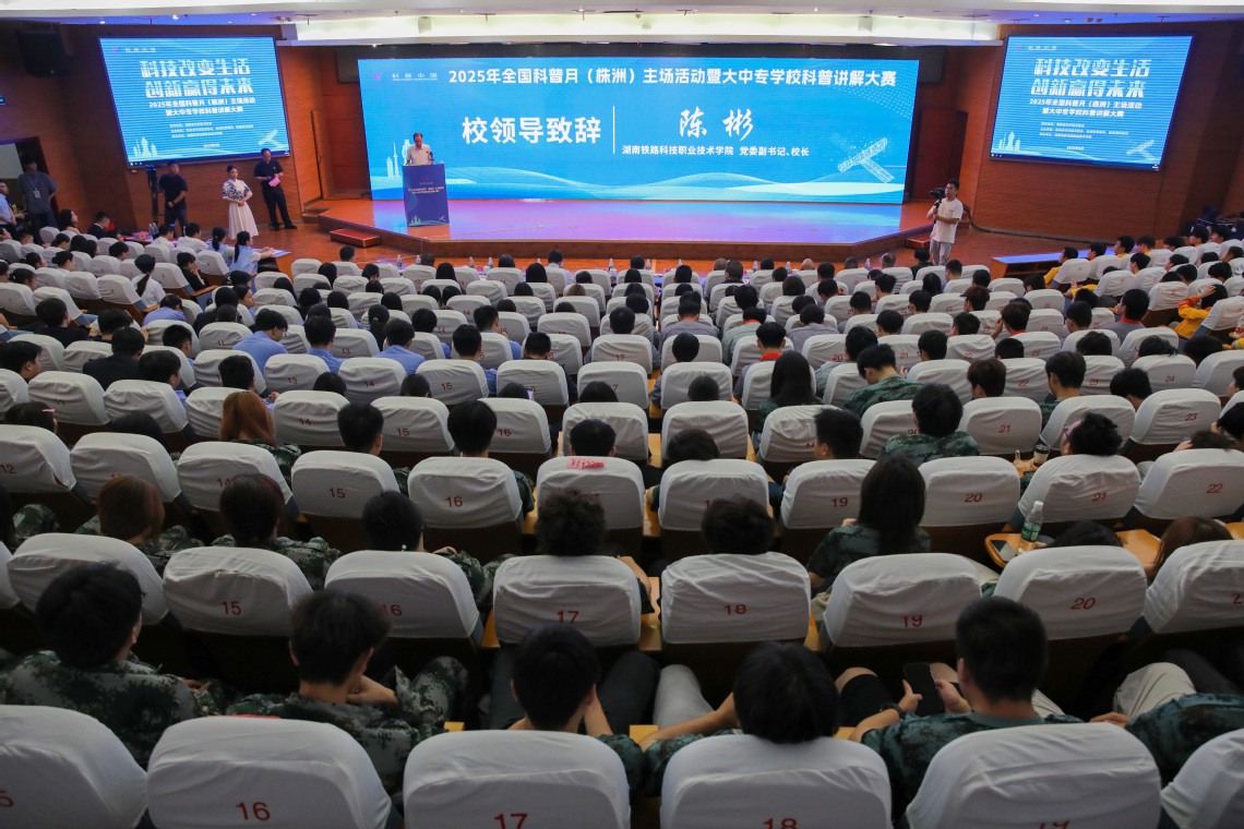 会后,还举行了大中专学校科普讲解大赛决赛。从列车的“小纸条”应答器到无缝钢轨技术,从巨轮的心脏到高铁“贴地飞行”的能量源泉,从厨房“催泪主角”到湘味美食三餐这样吃……来自湖南铁路科技职业技术学院、湖南汽车工程职业大学等大中专院校的12名师生,围绕高铁技术、船舶工程、中医药学等领域的科学原理,通过通俗的讲解、直观的演示和积极的互动,将专业知识生动呈现,充分展现了扎实的专业素养与科普魅力。