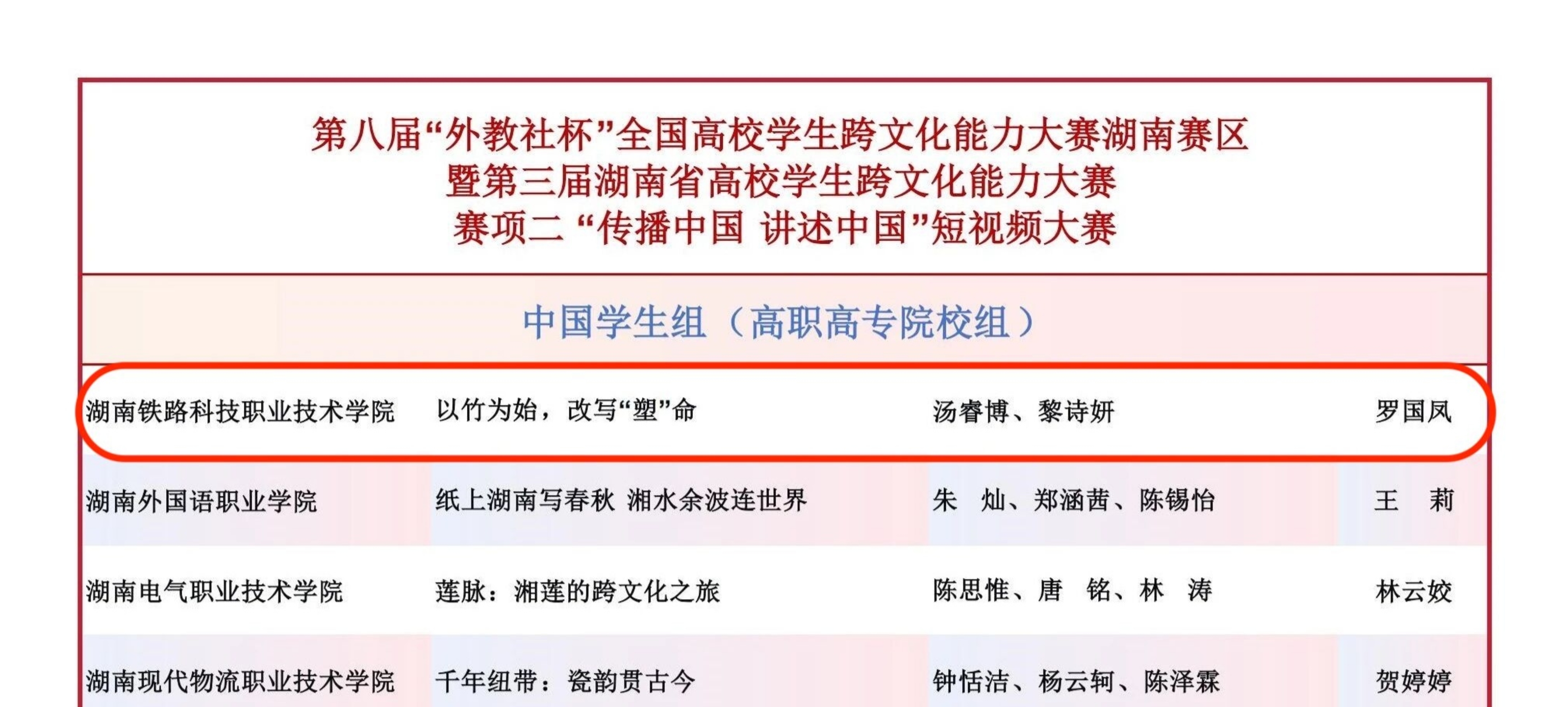 11月8日至9日,第三届湖南省高校学生跨文化能力大赛在长沙举行。我校表现优异,派出的两支参赛团队一举夺得高职院校组“跨文化能力大赛”与“讲述中国 传播中国”短视频大赛两项一等奖,学校更获评高职组唯一的“优秀组织奖”,创下我校在该赛事中的最佳战绩。